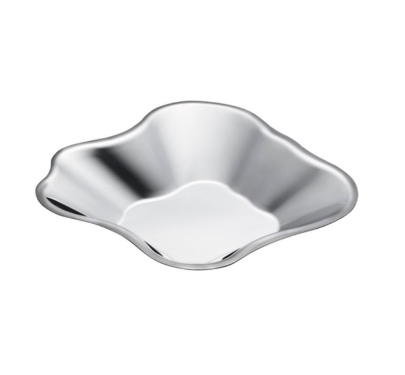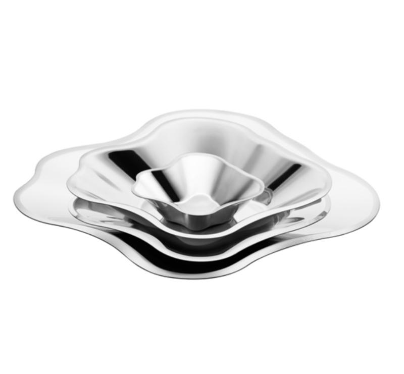 Klassinen muoto saa uusia ulottuvuuksia Aalto-kulhon modernien valmistusmateriaalien myötä. Alkuperäinen elävä muoto toistuu nyt ruostumattomasta teräksestä valmistetussa Aalto-vadissa. Tyylikkään sisustusesineen pinnasta heijastuva valo tuo mieleen veden liikkeen.