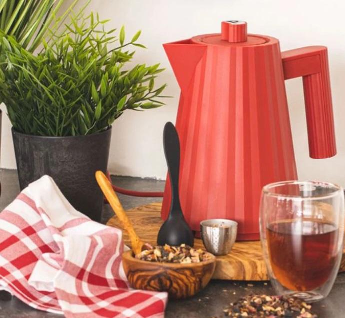 Näyttävä Alessi Plisse vedenkeitin, joka toimii keittiön katseenvangitsijana, pinta näyttää laskostetulta kankaalta.