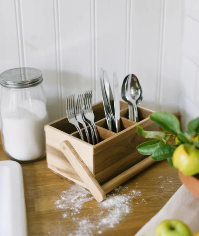 Tyylikäs puinen aterinteline, jossa saat säilytettyä aterimet keittiössä, sekä kesän pihakattauksissa. Teline helppo kuljettaa ja käyttää.