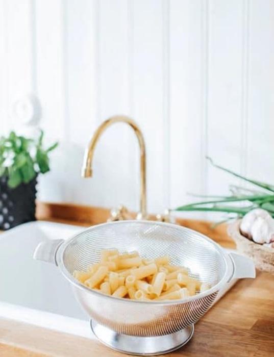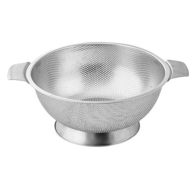 Ruostumattomasta teräksestä valmistettu jalallinen ja kahvallinen siivilä spagetin, salaattien, yms. huuhteluun ja valuttamiseen.