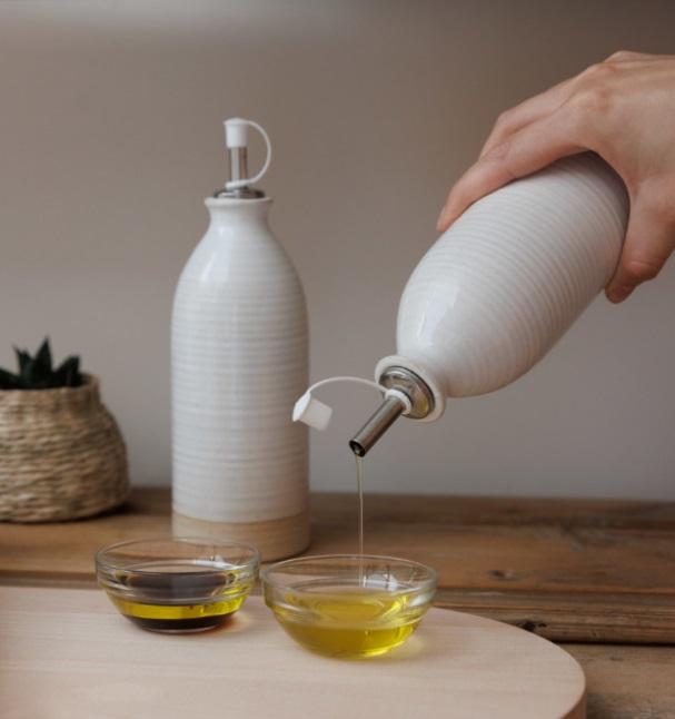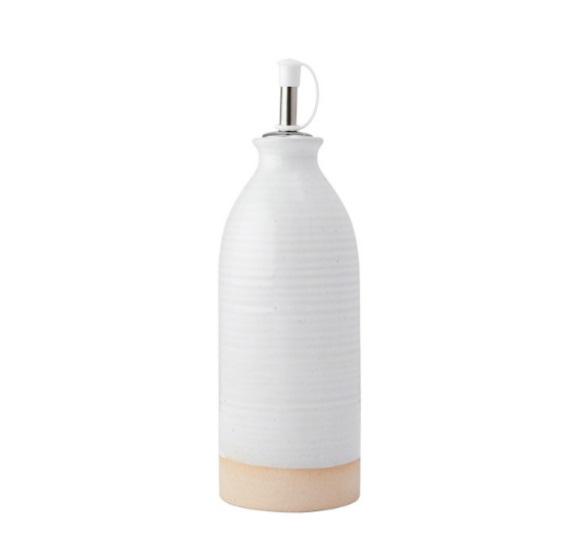Tyylikäs öljypullo on valmistettu korkealaatuisesta kivitavarasta ja viimeistelty klassisella kermanvärisellä lasitteella. Pullossa on lasittamaton, rouhea pohja ja ruostumaton teräksinen kaatonokka.