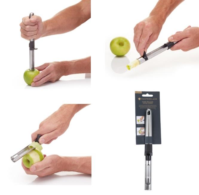 Tällä kätevällä omenaporalla kuorit omenan, sekä irrotat omenan karan. Karan saat painettua helposti ulos vipua vetämällä. Luistamaton kahva.
