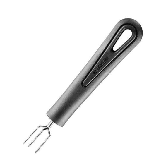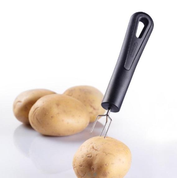 Kätevä kolmepiikkinen apuväline kypsien, kuumien perunoiden nostoon ja kypsyyden testaukseen.