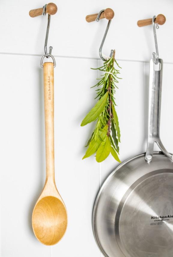 Tukeva puukauha, jossa varressa KitchenAid-logo ja metallinen ripustuslenkki.